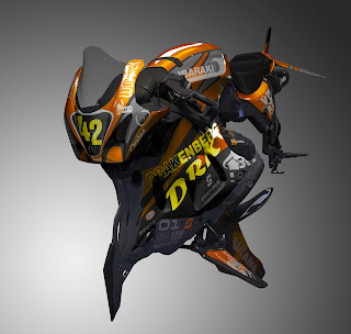 I figure Gina, as a courier, would be riding a street bike, battered up and past its prime but possibly well tuned all the same. I was thinking here I'd try to design a sports bike version, something she'd aspire to.